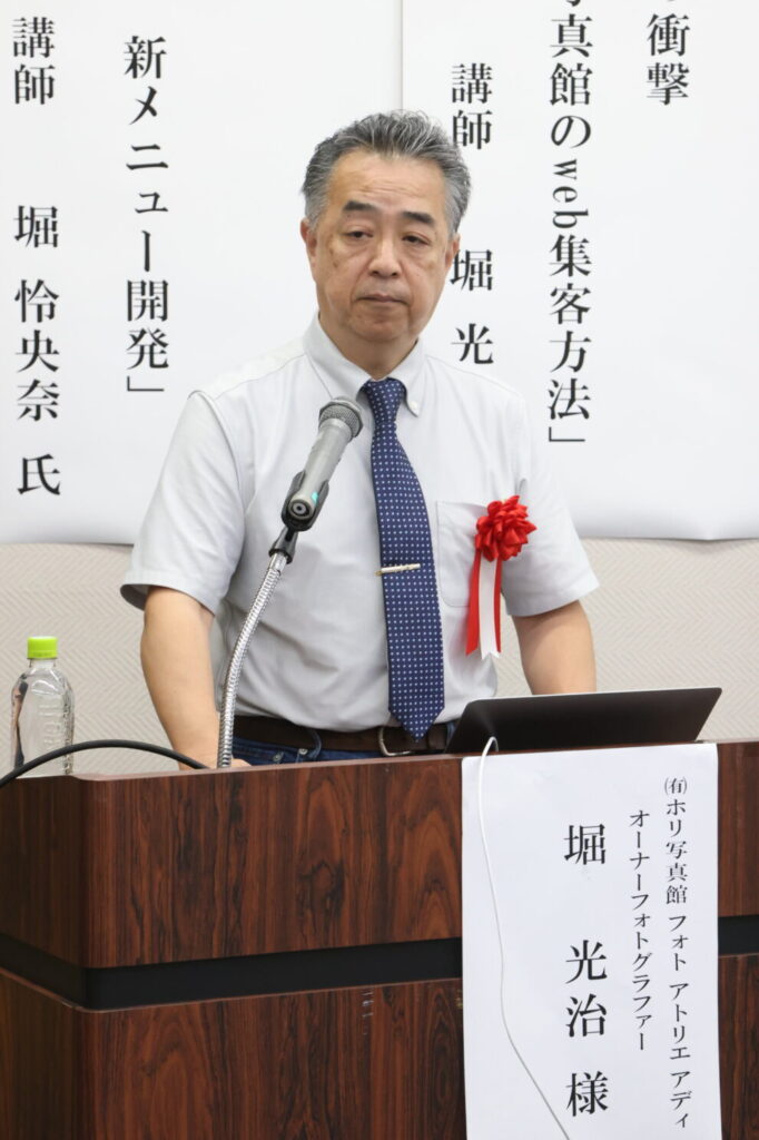 講習会2では、石川県から8年前に続きの2度目の登壇となる堀 光治様を講師に迎え、「新産業革命 生成AIの衝撃 AIを活用した写真館のWeb集客方法 」と題する講演が行われました。AIを活用した最新のマーケティング手法や経営戦略について具体的に紹介され、参加者にとって非常に実践的で有意義な内容となりました。