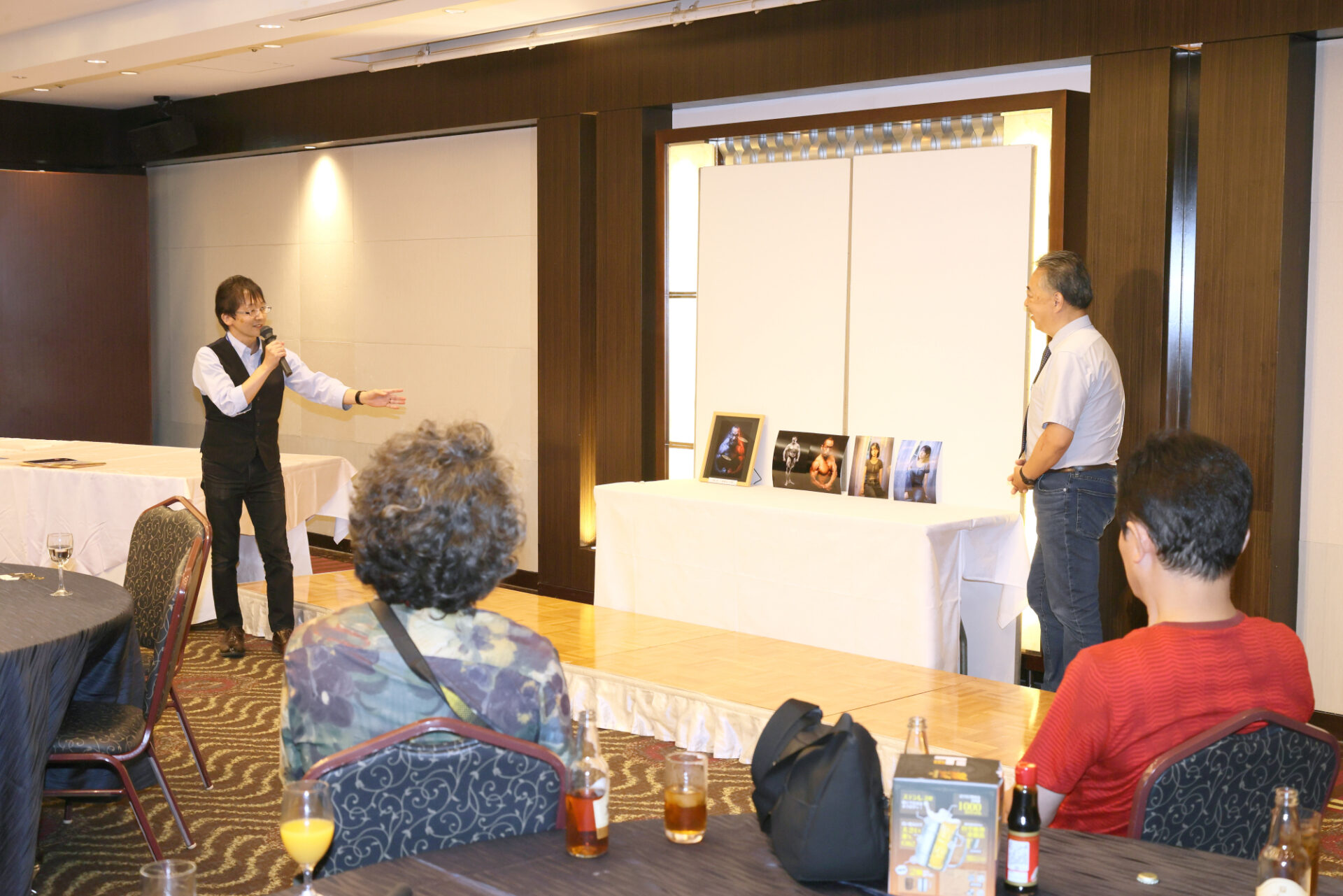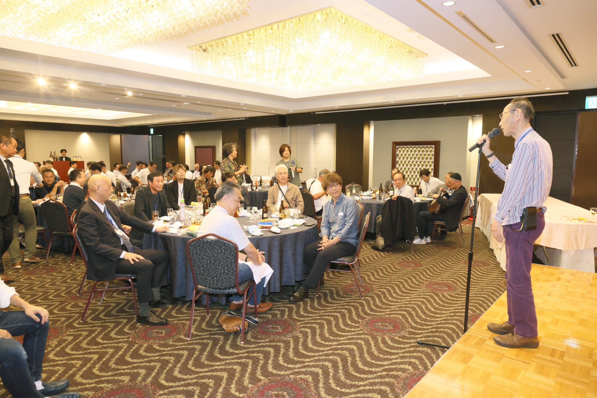 セミナー終了後は全員で記念の集合写真を撮影し、福山ニューキャッスルホテルへ会場を移しての懇親会となりました。懇親会は、中国ブロック元文協理事・広島県元会長の生長俊幸様の乾杯のご発声で幕を開け、地元メンバーによる趣向を凝らした催し物で大いに盛り上がりました。恒例となった豪華景品が全員に当たる抽選会やじゃんけんゲームでは、笑顔と歓声が絶えず、会員同士の交流がより一層深まりました。