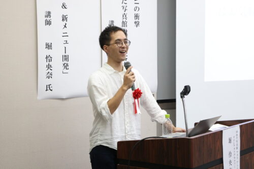 続く講習会では、前日に引き続き堀光治様のご子息、堀 怜央奈様を講師に迎え、「データ全盛時代の料金プラン&新メニュー開発」と題した講演が行われました。若さあふれる発想力としっかりとした分析に基づく内容は非常に実践的で、参加者からも感嘆の声が上がりました。若い世代の力強い感性に、多くのベテラン会員が刺激を受けたようでした。